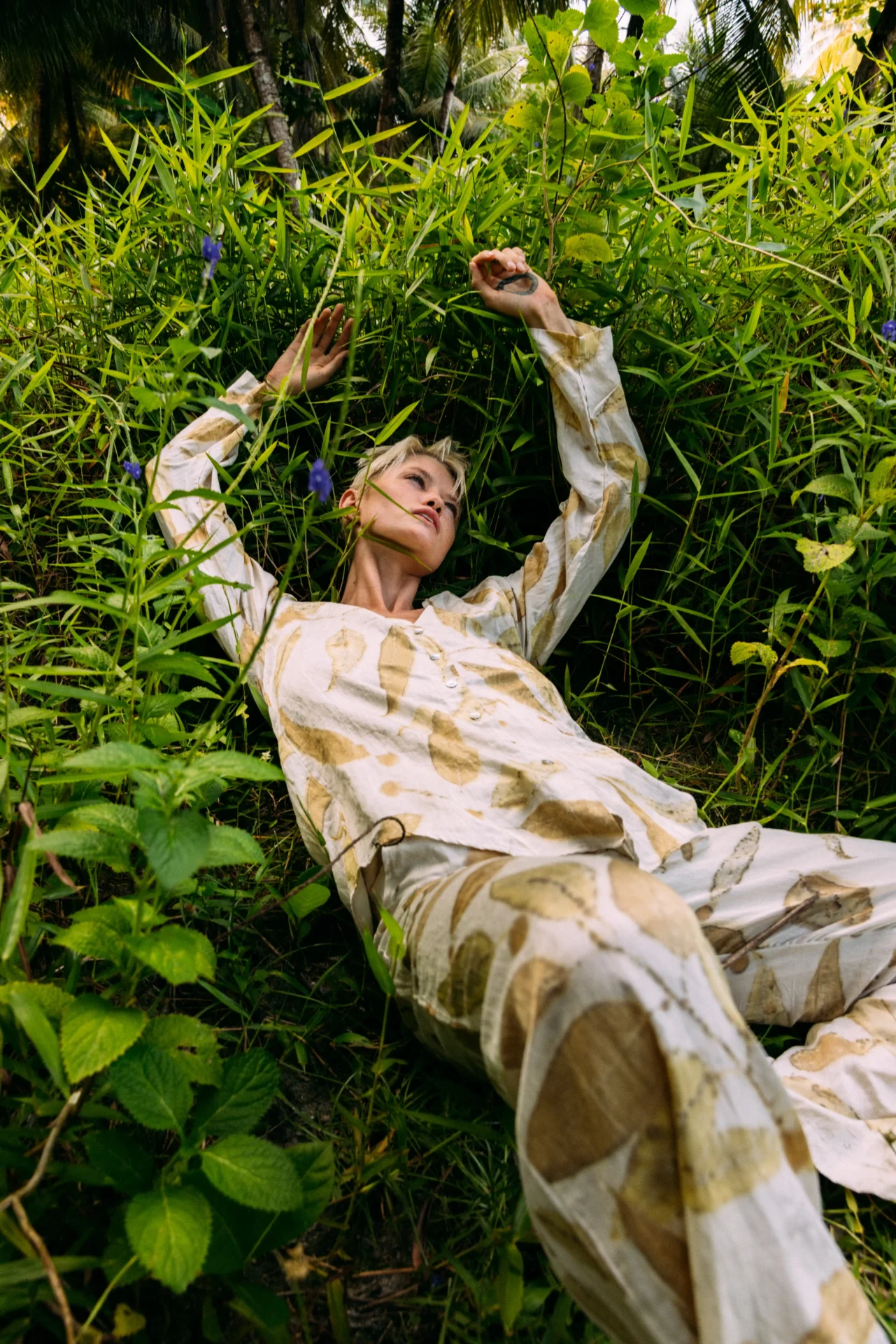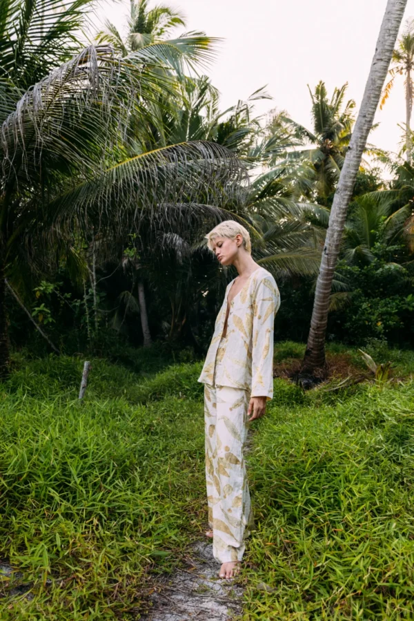 The Eucalyptus top is a tribute to nature’s artistry, featuring a handmade eco-print process with real eucalyptus leaves. Crafted in Bali, each piece is carefully made by pressing eucalyptus leaves onto soft, organic silk cotton fabric, capturing their delicate patterns and natural beauty.